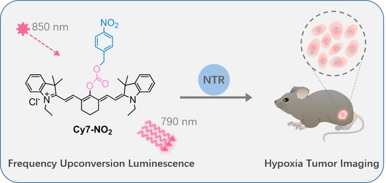 癌症是目前影响人类寿命的主要因素,对癌症的治疗,除了手术以外,通常采用放疗或化疗的治疗形式。但是,在治疗的过程中,缺血缺氧肿瘤,即所谓的乏氧肿瘤对放化疗敏感性较低,从而造成放化治疗疗效降低甚至无效。因此,在放化疗之前,对肿瘤缺氧程度的评判显得尤为重要,其中检测肿瘤缺氧标志物是一种简单有效的评判肿瘤缺氧程度的方式。在众多乏氧肿瘤标志物中,硝基还原酶在大部分缺氧肿瘤中能大大表达。缪教授团队通过采用近红外荧光染料为发光报告中心,加以硝基还原酶检测基团修饰,得到了近红外光学响应的检测探针,通过独特的频率上转换检测方式,得到了极低的检测线和较高的信噪比,实现了对乏氧肿瘤在体检测新的突破。该种检测方法试剂制备简单,对检测仪器要求较低,可快速对乏氧肿瘤进行判别。该成果有望进一步应用于生物医学检测领域。