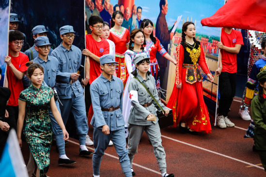 开幕式上,来自学校的19支队伍在国旗队的带领下依次走过主席台,为大家带来了别具一格的入场式表演。2019年是新中国成立70周年,各参演方阵也在开幕式中融入了诸多爱国元素:五四青年的学生装、嘉兴南湖的游船、红军战士的冲锋号等,展现了理工学子热忱的爱国心。此外各个学院也充分展现了各自的学科特色:3D打印大飞机、免疫系统的三道屏障、5G信号塔等都直观地表达了学子们对知识的热情。今年的教工韵律广播操表演和学生军体操展演也展现了我校师生良好的精神面貌。