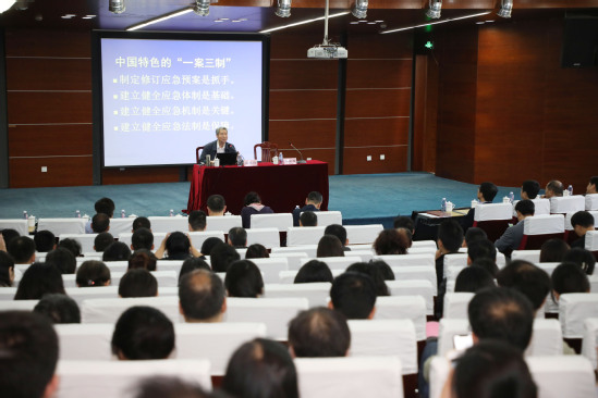 闪淳昌在报告中介绍了新时期公共安全与应急管理工作的发展态势,并结合大量案例,深入剖析和总结了城市应急管理的不足及经验教训。他讲到,老百姓有安全感,社会才有安定感,国家才能长治久安。要完善党委领导、政府负责、社会协同、公众参与、法治保障的社会治理体制。各级领导干部在面对突发事件时要建立“敬畏事业、敬畏规律、敬畏生命”的心态,要坚持“五早”原则,即早发现、早报告、早研判、早处置、早解决。要高度重视预案的重要性,他讲到“应急管理意识实际上就是居安思危、思则有备的意识。应急预案不是万能的,但没有预案是万万不能的,而且没有演练过的预案不是好的预案。”安全文化建设是安全工作的基础,要大力开展安全文化建设,树立安全发展理念,弘扬“生命至上、安全第一”的思想,努力形成“社会和谐人人有责,和谐社会人人共享”生动局面。