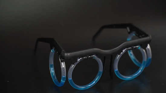 记者看到,不晕眼镜有着四个装着一半蓝色液体的圆环,在重力的影响下,会随着你在车内的颠簸而流动,但液体始终与地平线保持水平,并利用这种方式来模拟视角的角度和运动。