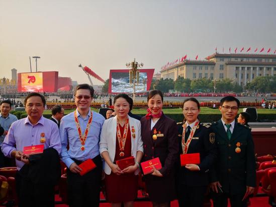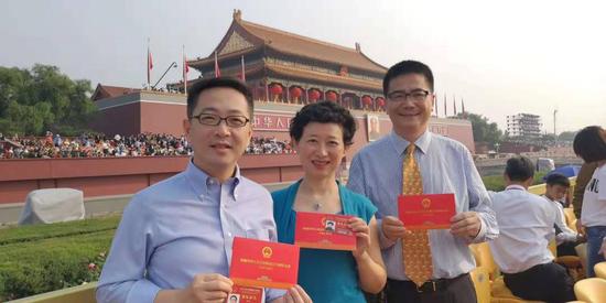 陈寅(左一)和朱萍(中)在国庆观礼台上留影