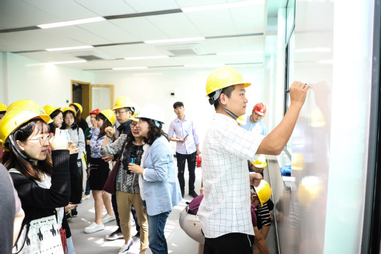 为了能及时听到师生们的反馈,教务处、基建处、信息办等部门负责人担当起样板间“解说员”,现场介绍设计亮点、使用方法、备选方案等,单就一个楼道的墙壁就小范围做了“常规款”“浮雕款”两种风格让师生对比参观选择。