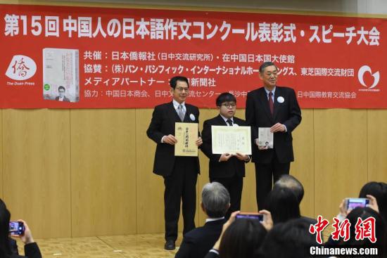 12月12日,第15届中国人日语作文大赛颁奖仪式在北京举行,来自上海理工大学的研究生潘呈以《为东京奥运减少误译,我力所能及之事》获得大奖“日本大使奖”。本届日语作文大赛共收到来自208所学校的4359名学生的应征作文。图为潘呈(中)获奖后与日本驻华大使横井裕(右)、日本侨报社总编辑段跃中合影留念。