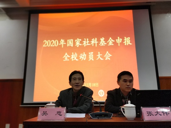 12月18日下午,我校2020年度国家社科基金项目申报动员大会在格致堂201报告厅召开。副校长吴忠出席会议并作动员讲话,人文社科相关学院的近100名教师参加,会议由科技处处长张大伟主持。