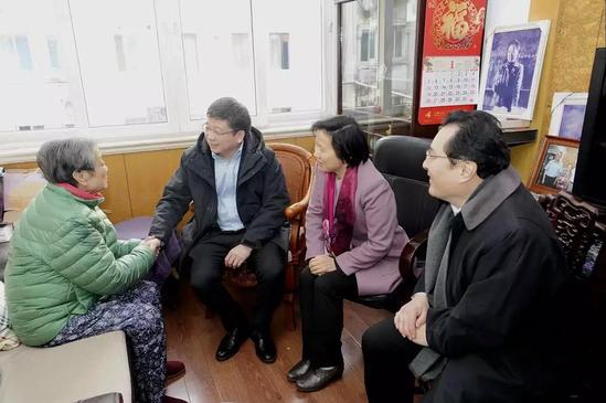 在上海市徐汇区建襄小学名誉校长吴佩芳家中,90岁的吴佩芳校长激动不已,伸出颤颤巍巍的双手握住陈群副市长的手。