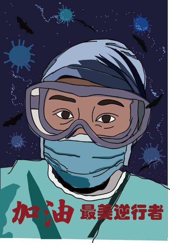 “所谓白衣天使,不过是一群孩子,换了身衣服,学着前辈的样子,和死神抢人。真的辛苦了!向白衣天使致敬!”有感而画。主体是逆行的白衣天使,粉色字体和装饰源于武汉的樱花。