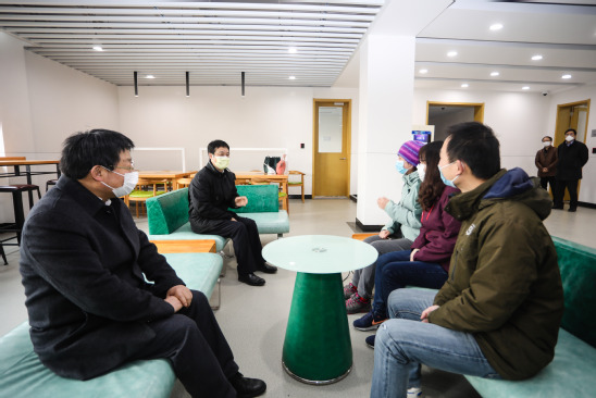 在第一教学楼,校长丁晓东与师生们一同在线观看了战“疫”公开课,在线查看全校在线教学的实时运行情况。随后,校长丁晓东与教师代表简要交流在线教学相关情况。