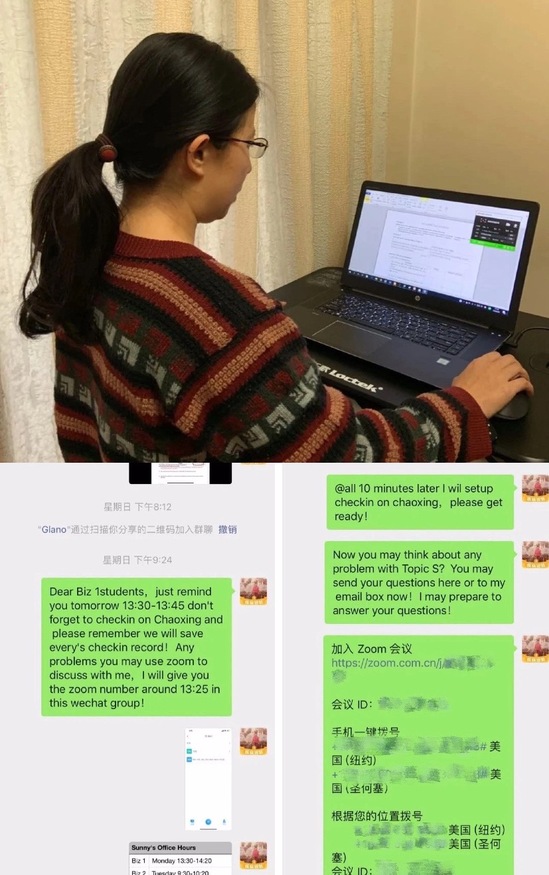 “因为是在周末要求同学们试用Zoom软件,我一开始比较担心同学们的配合情况,但出乎意料的是,大一商科14个小班的同学们都很配合地完成了教学演练,也提出了自己的问题和想法,师生在线交流更顺畅,大家效率很高。其中特别感动的是各班的志愿者,主动请缨承担起班级微信群管理的工作,成为老师和同学们沟通的桥梁。”同学们的自主性让教授Economics 经济学概论和Business Studies 商务概论的Sunny GUO老师印象非常深刻。