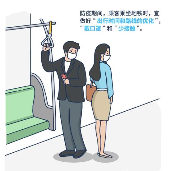 防疫期间,乘客乘坐地铁时,宜做好“出行时间和路线的优化”,“戴口罩”和“少接触”。