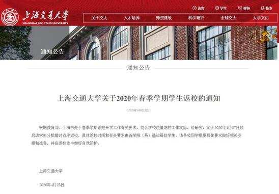 上海交通大学4月23日公布了返校时间,将于4月27日起启动学生分批返校工作。