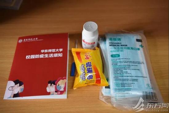 △华东师范大学为返校学生准备了疫情期间住宿小贴士、温度计和口罩等防疫物资