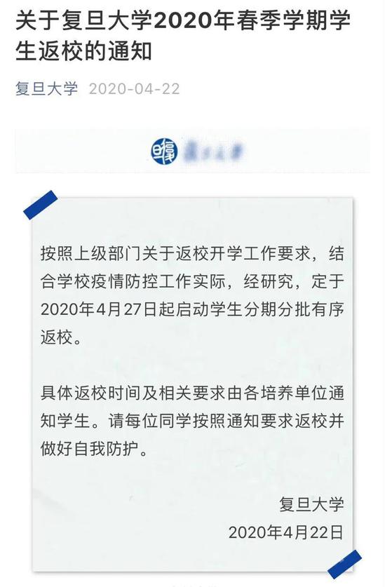 复旦大学22日宣布,按照上级部门关于返校开学工作要求,结合学校疫情防控工作实际,经研究,定于2020年4月27日起启动学生分期分批有序返校。具体返校时间及相关要求由各培养单位通知学生。请每位同学按照通知要求返校并做好自我防护。