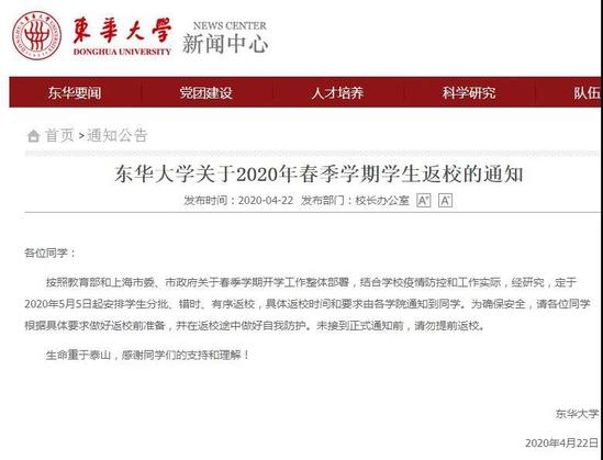 东华大学22日宣布,按照教育部和上海市委、市政府关于春季开学工作整体部署,结合学校疫情防控和工作实际,经研究,定于2020年5月5日起安排学生分批、错时、有序返校,具体返校时间和要求由各学院通知到同学。为确保安全,请各位同学根据具体要求做好返校前准备,并在返校途中做好自我防护。未接到正式通知前,请勿提前返校。