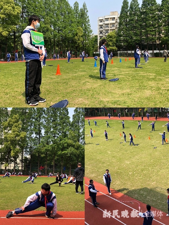4个班级的学生在体育老师的引导下排队下楼。操场上,老师们已经为大家分好区域,放好运动装备。80余名学生分成4组分别在操场、跑道和草坪运动。