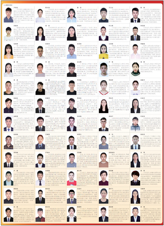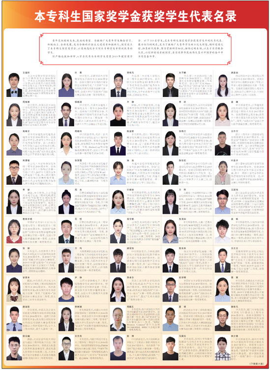 经严格选拔和评审,6万名优秀本专科学生荣获2019年国家奖学金。以下110名学生,是本专科生国家奖学金获奖学生中的优秀代表。展示他们的风采,是为了激励广大青年学生树立远大理想,胸怀爱国之情,担负时代使命,努力掌握科学知识,锤炼过硬本领,以真才实学服务人民,以创新创造贡献国家,在实现中华民族伟大复兴中国梦的奋斗中书写青春华章。