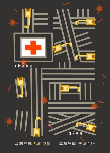 火神山医院的工地上,挖掘机留下的一道道辙为学生蒋倩带来灵感,她的《战胜疫情》将挖掘机留下的痕迹设计成“战疫”二字,致敬这场战疫中的基建队逆行者。
