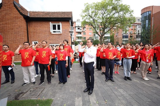 “我志愿成为一名高校辅导员,拥护党的领导,献身教育事业……”在刘湛恩烈士故居主题馆前,100余名身穿印有“永远跟党走”字样红色T恤的上理人,正对着鲜艳的党旗宣誓,并重温入党誓词,坚定辅导员育人的初心和使命。