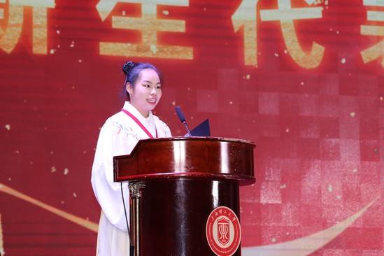 来自2021级新闻传播06班的吴茜玥同学作为新生代表发言。她以《乔木亭亭倚盖苍,吾辈青年自担当》为题,抒发了上理学子对父母、师长与亲友的感恩之情,回顾了上理学子初入大学校园的懵懂与忐忑,表达了上理青年对理想与激情的坚守,展现了新时代上理青年的使命与担当。