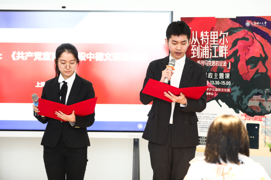 “一个幽灵,共产主义的幽灵,在欧洲游荡。为了对这个幽灵进行神圣的围剿,旧欧洲的一切势力,教皇和沙皇、梅特涅和基佐、法国的激进派和德国的警察,都联合起来了……”标准的发音、充沛的情感,德语系的沈语桐和汪振宇同学正在用中德双语朗读《共产党宣言》中的重要选段。