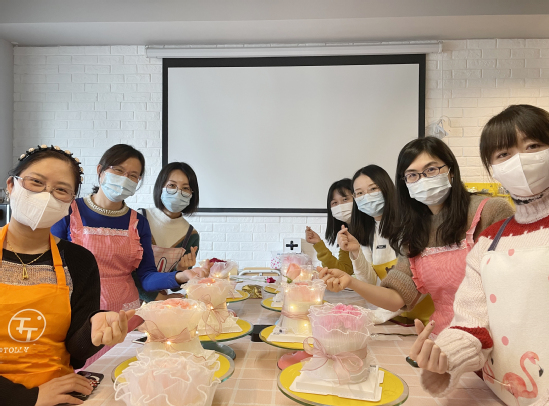 中英学院开展烘培坊活动,女教师制作鲜花蛋糕庆祝节日
