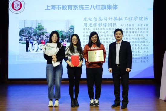 孙跃东为上海市教育系统“三八红旗集体”光电学院医用光学影像团队颁奖