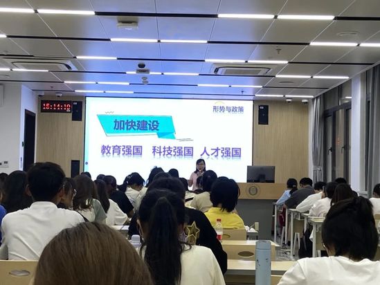下午,突然下起暴雨,但是师生们上课的热情不减。中德学院大一新生岑欣颐与室友陈思雨冒雨早早赶到教学楼,本以为会空荡荡的教室,前排全部坐满了新同学,她们不由得感慨:“看来下暴雨也得‘抢’座位啊。”在随后的课堂上,张巍老师以华为公司为例,向学生们讲述了教育、科技、人才系统谋划的必要性,同学们的第一节“形势与政策”课正式开启。