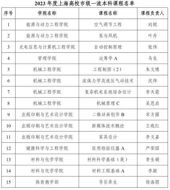 近日,上海市教育委员会公布了2023年度上海高校市级一流本科课程认定结果,我校《空气调节工程》等15门课程被认定为上海高校市级一流本科课程,其中市级一流公共基础课程1门,市级一流专业基础课程3门,市级一流专业核心课程9门,市级一流产教融合课程2门。截至目前,我校共获批上海高校市级一流本科课程53门,获批数量位列市属高校前列。