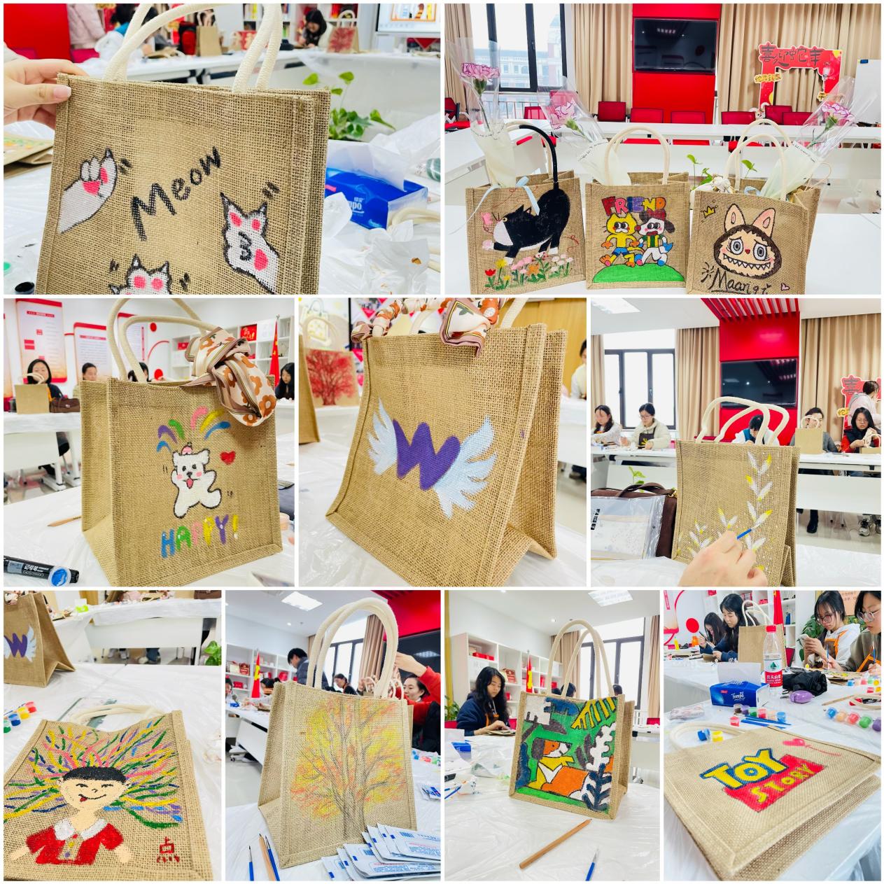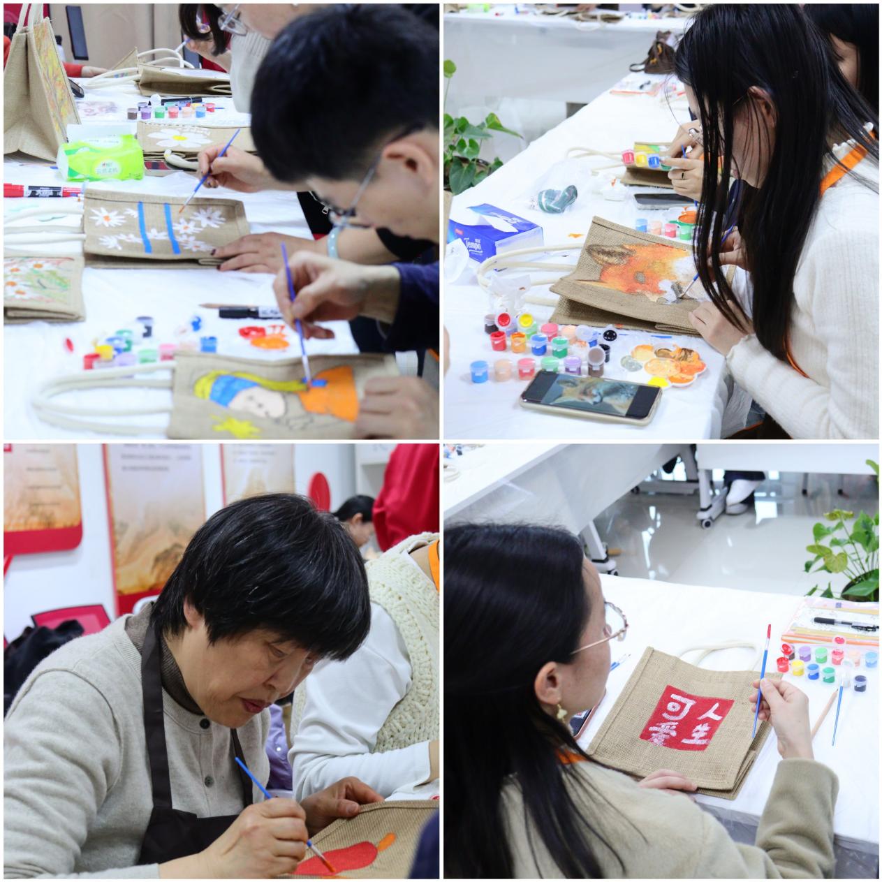 活动现场,师生们开始构思图案,五彩斑斓的颜料在参与者们的手中自由流淌,如同温暖的阳光洒满心间。大家纷纷拿起画笔,将内心的情感与色彩完美融合,在麻布袋上开启了属于自己的心灵探索之旅。伴随着优雅的音乐,每个人沉浸在自己的创作中,每一笔、每一划都透露出对生活的热爱与对未来的美好憧憬。有的人绘制了可爱的卡通形象,有的人是抽象的艺术图案,还有的人将自己喜欢的文字巧妙地融入到了设计中。每个人的布包图案都独具特色,展现出了不同的风格和个性,现场气氛温馨而热烈。