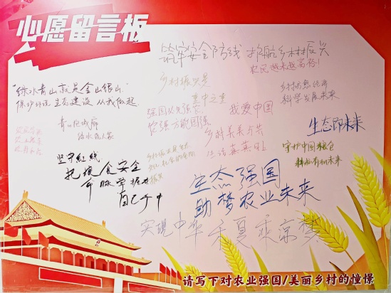从耄耋学者的谆谆教诲到青年学子的激昂思辨,从历史记忆的深刻反思到未来图景的美好期许,这场跨越代际的对话不仅是对中央一号文件的深度解读,更是一次精神传承与使命接力。活动最后,参会师生在留言互动墙上写下了自己对农业强国和美丽乡村的美好憧憬。“实现中华禾下乘凉梦”“青心抱城郭,绿水绕人家”“乡村美美与共,生活蒸蒸日上”等留言,充分展现了出版学院师生扎根乡土、服务“三农”的责任担当和坚定决心。