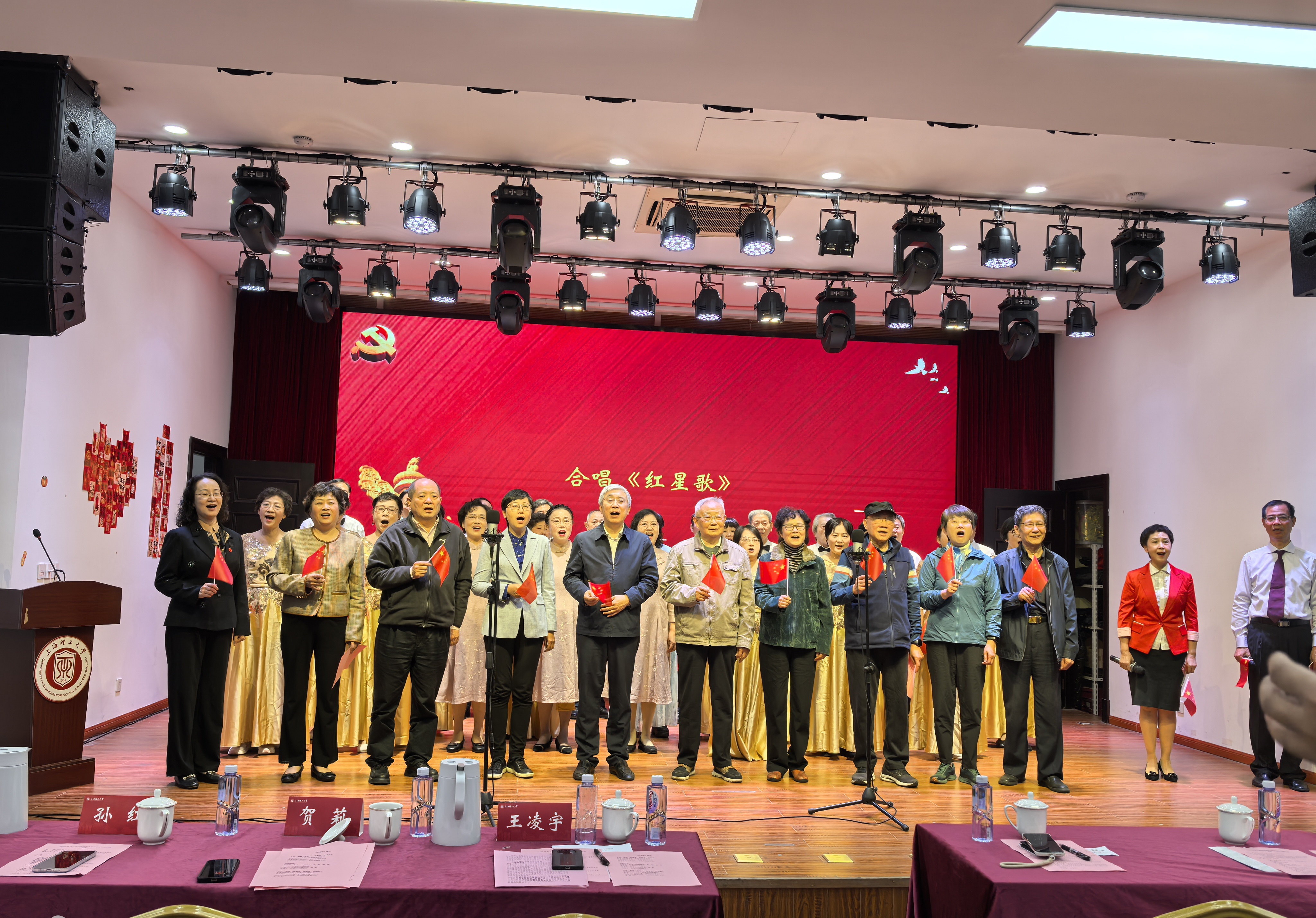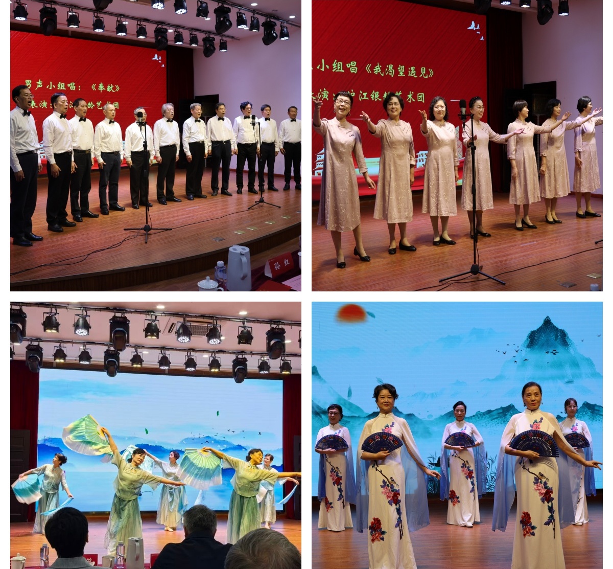 文艺表演中,“沪江银龄艺术团”带来的男声小组唱《奉献》,以深情豪迈的歌声唱出老同志对校园的热爱与奉献情怀;女生小组唱《我渴望遇见》,用优美旋律表达对校园生活的眷恋与美好生活的向往;舞蹈与走秀《穿越时空的思念》融合优雅与时尚,展现老同志活力风采。活动最后,校领导、退休局级干部代表与全体演出人员、在场老同志齐声合唱《红星歌》,熟悉的旋律回荡现场,红色初心与校园情怀在歌声中交融,将活动氛围推向高潮。