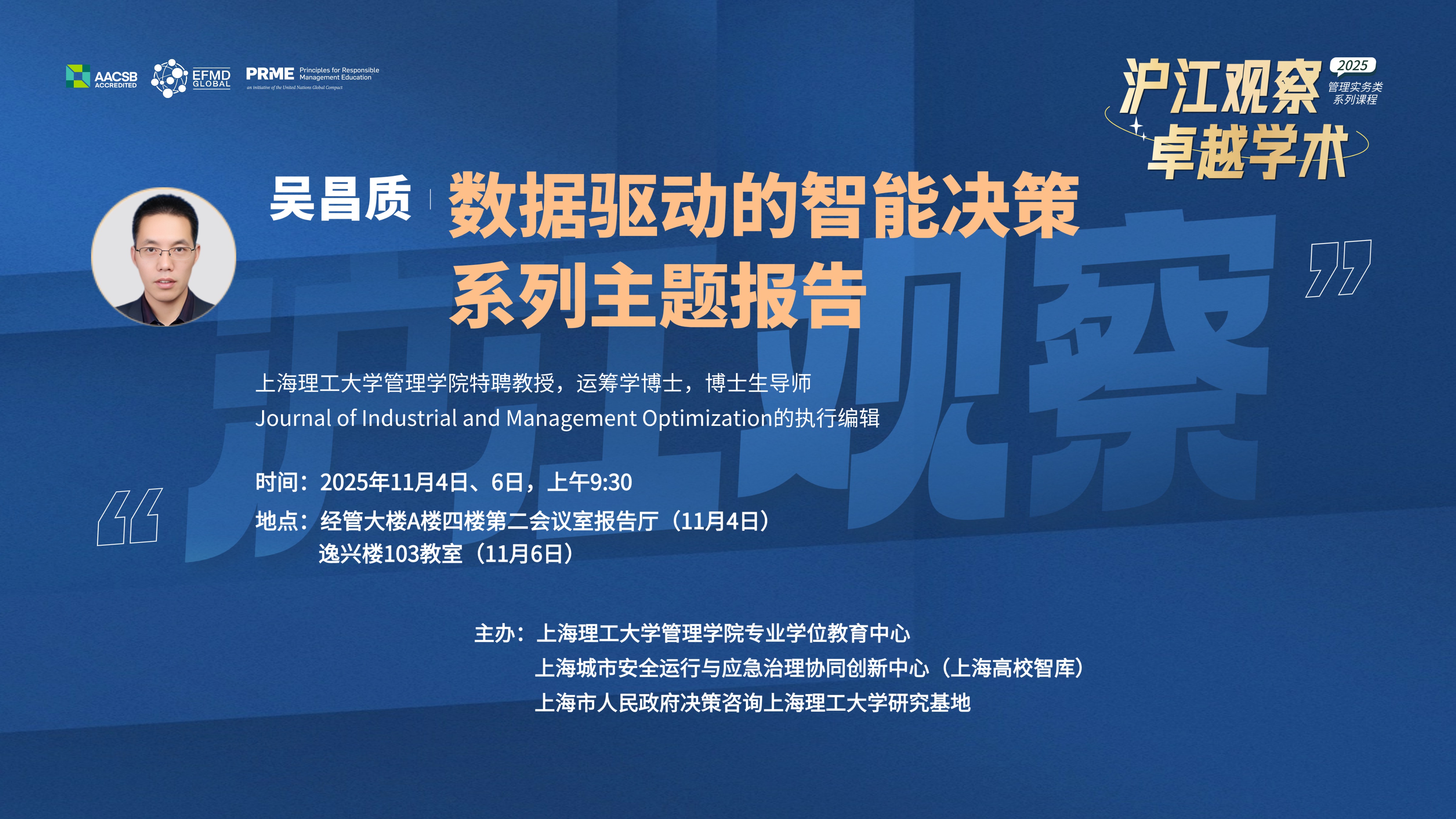 报告人简介:吴昌质,上海理工大学管理学院特聘教授,运筹学博士,博士生导师。Journal of Industrial and Management Optimization的执行编辑。多年来一直从事运筹学与机器学习相关领域的研究。先后主持国家自然科学基金项目、澳大利亚国科会项目、教育部科技计划重点项目及归国留学基金项目等项目十多项;在国际学术期刊发表被SCI收录论文100多篇,在运筹优化等领域有深入的研究。