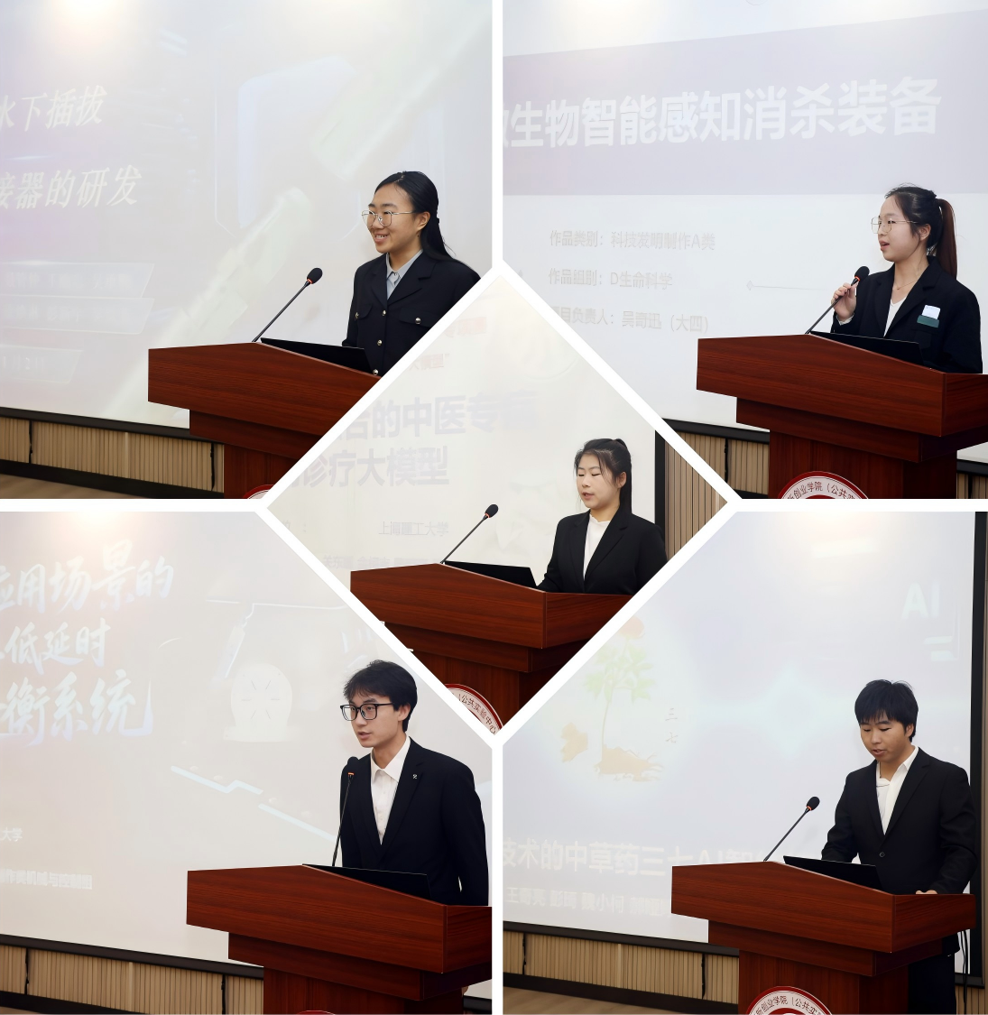 会上,校团委负责人介绍了赛事组织与项目培育情况。来自光电学院、管理学院、健康学院、理学院的三个主赛道、两个人工智能+专项赛入围项目团队依次进行了现场展示,涵盖深海光纤连接、智能消杀、中医诊疗大模型等多个前沿领域,展现了上理学子扎实的科研实力与创新活力。