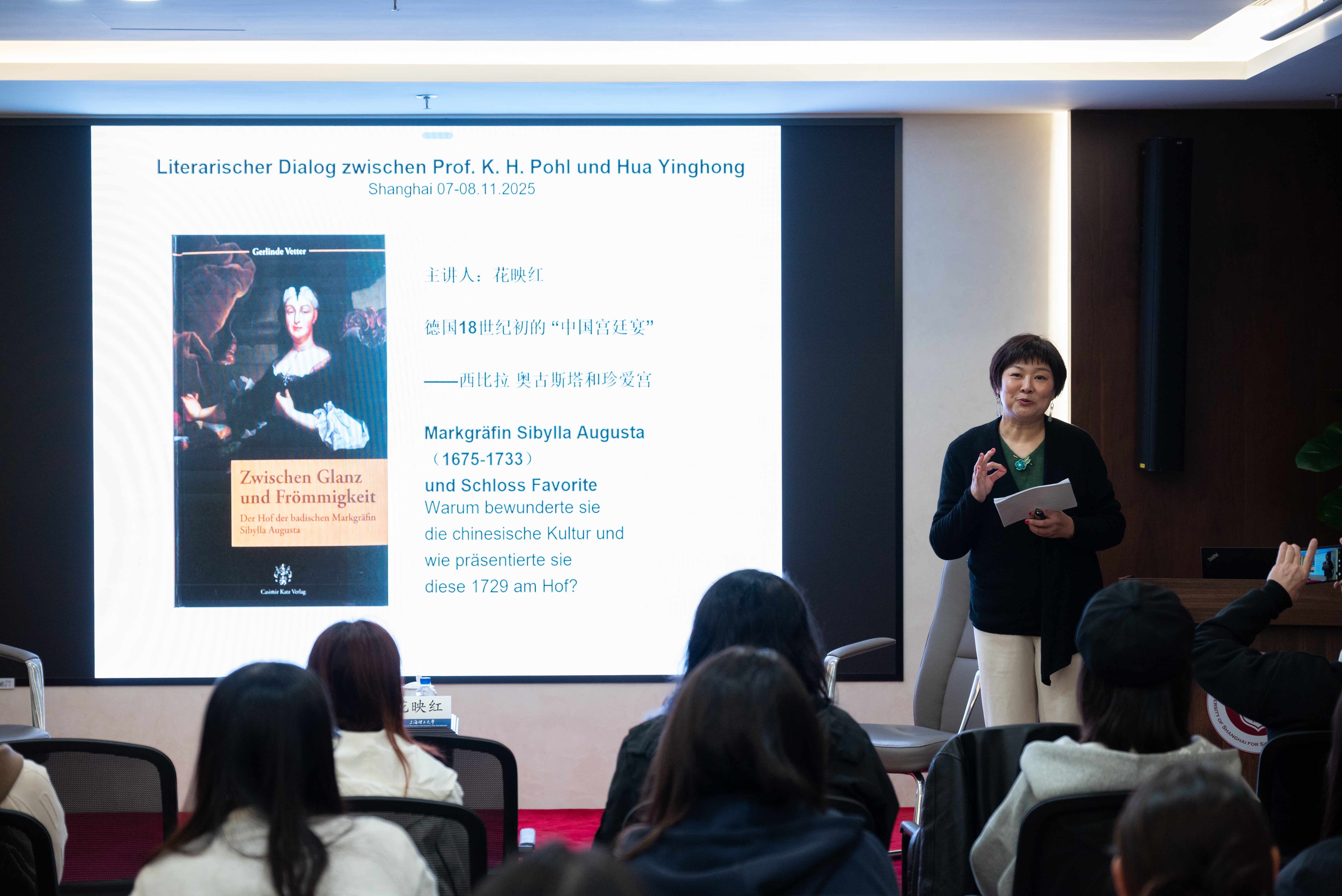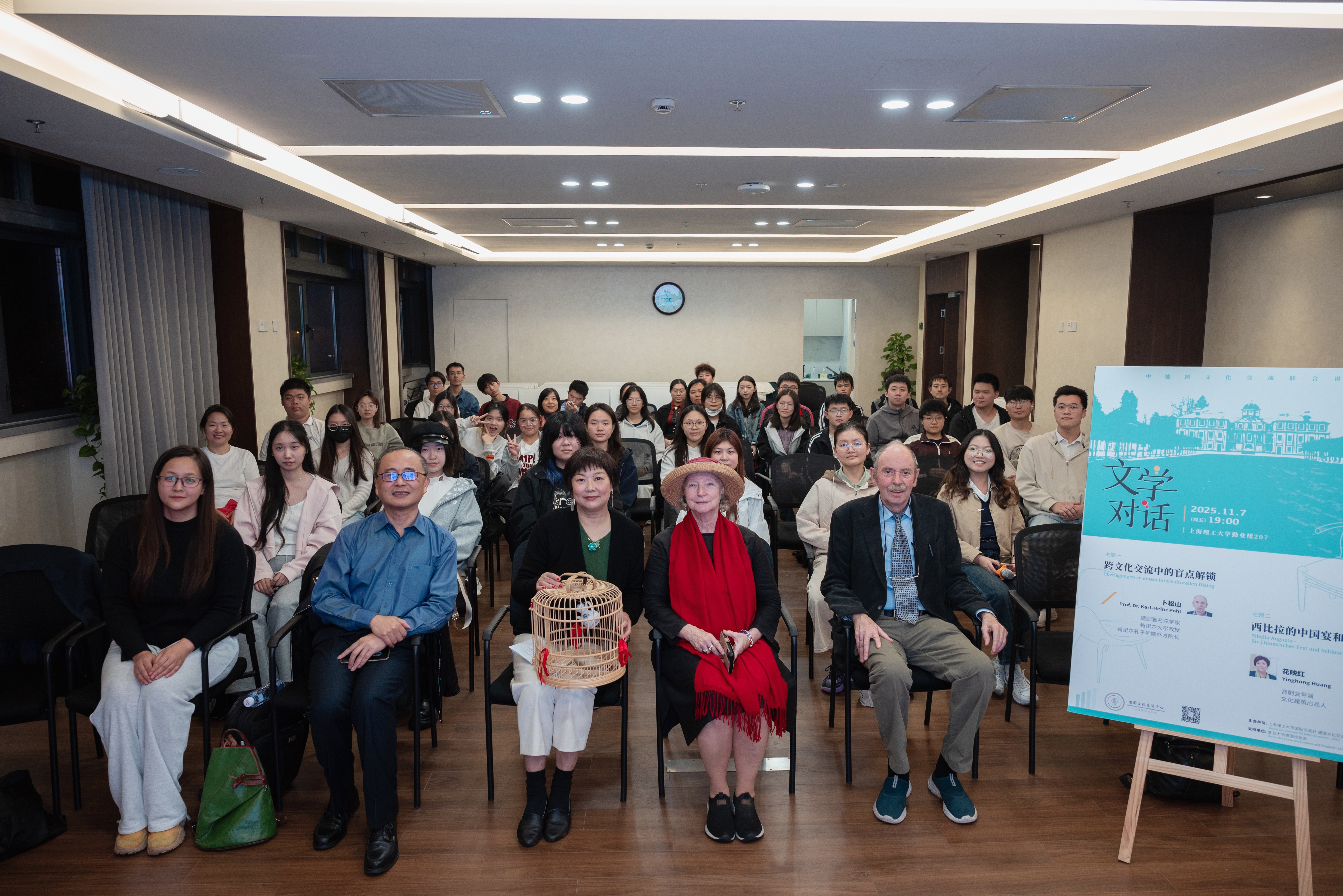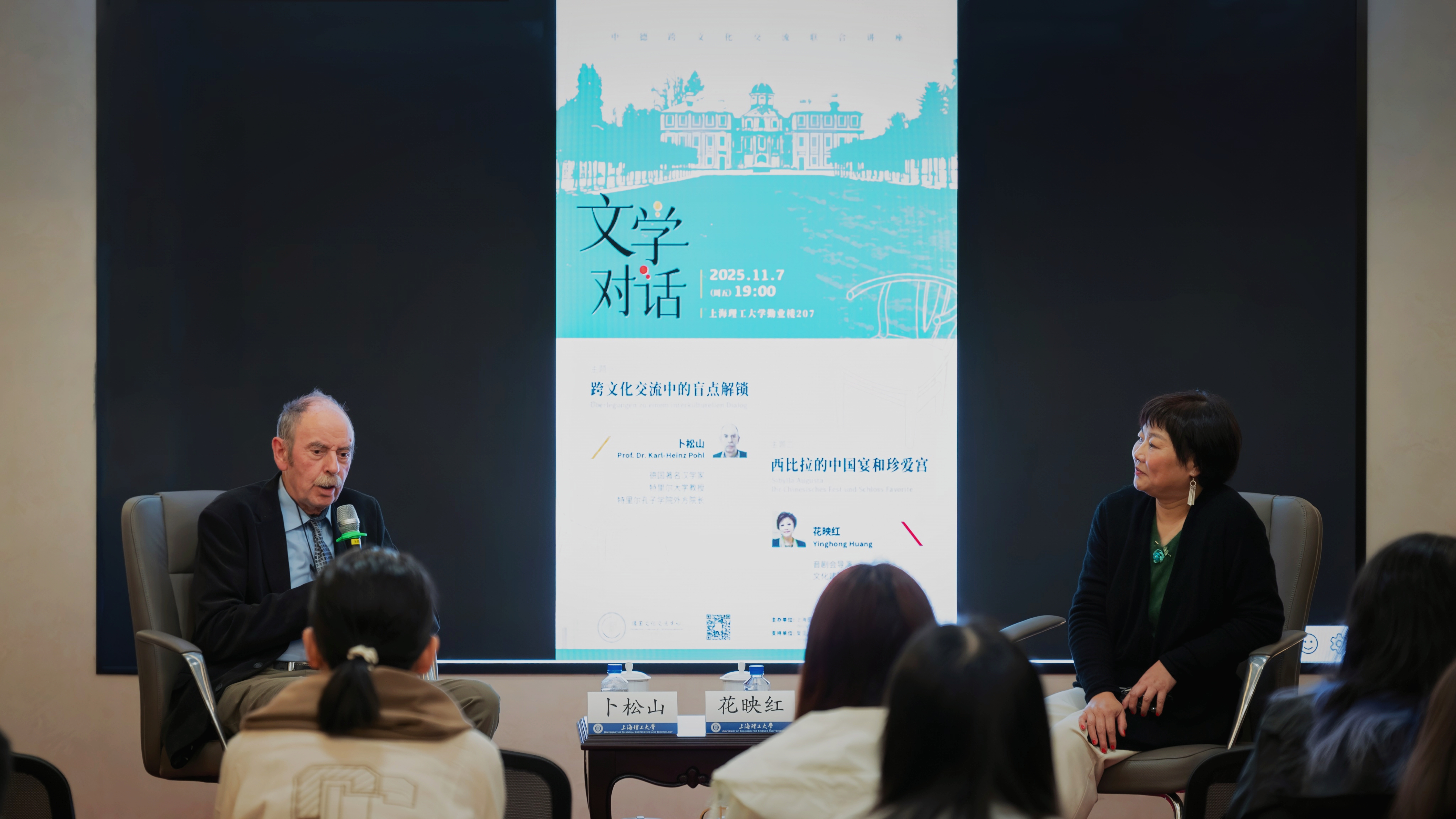 11月7日,一场以“文学对话——中德跨文化交流”为主题的联合讲座在上海理工大学德国文化交流中心成功举办。本次活动由上海理工大学国际交流处德国文化交流中心主办,得到了复旦大学德国校友会的大力支持,吸引了众多师生及中外文化爱好者参加。活动邀请到德国著名汉学家、特里尔大学孔子学院德方院长卜松山教授(Prof. Dr. Karl-Heinz Pohl)与著名导演、文化建筑出品人花映红女士,两位嘉宾以不同视角展开思想碰撞,共同探讨文学与文明交流的深层关系。