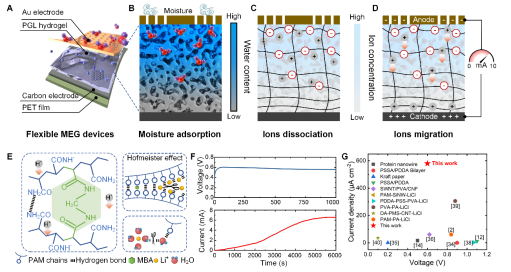 研究团队提出了一种基于PGL水凝胶的湿度发电机,通过实验和分子模拟验证了其高效的工作机制,以准确预测PMEG的性能并指导其优化设计。该器件在30 °C、80 %RH条件下实现0.6 V开路电压与0.58 mA cm⁻²短路电流,单单元输出功率即可媲美以往数百单元并联水平。多物理场耦合模型首次将“化学—传质—电场”统一,实现性能预测与材料反向设计,为自供能柔性电子提供了一条可扩展、低成本、高功率的湿电技术路线。