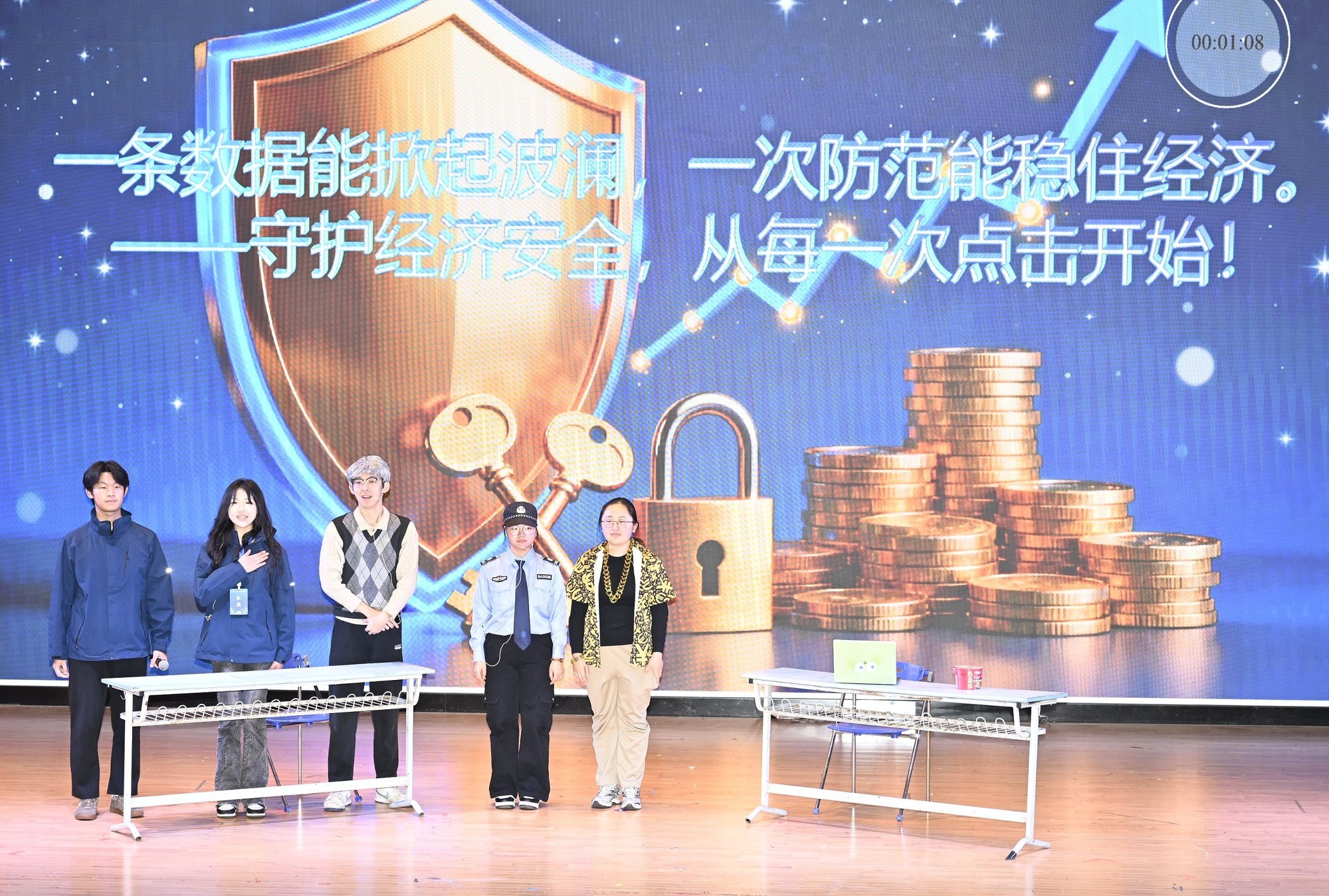 在安全公开课环节,参赛队伍围绕军事、经济、生态、政治、生物、资源、人工智能、社会等八大安全领域,以情景剧、小品等形式进行展示,体现大学生对国家安全的多元认知与创新表达。