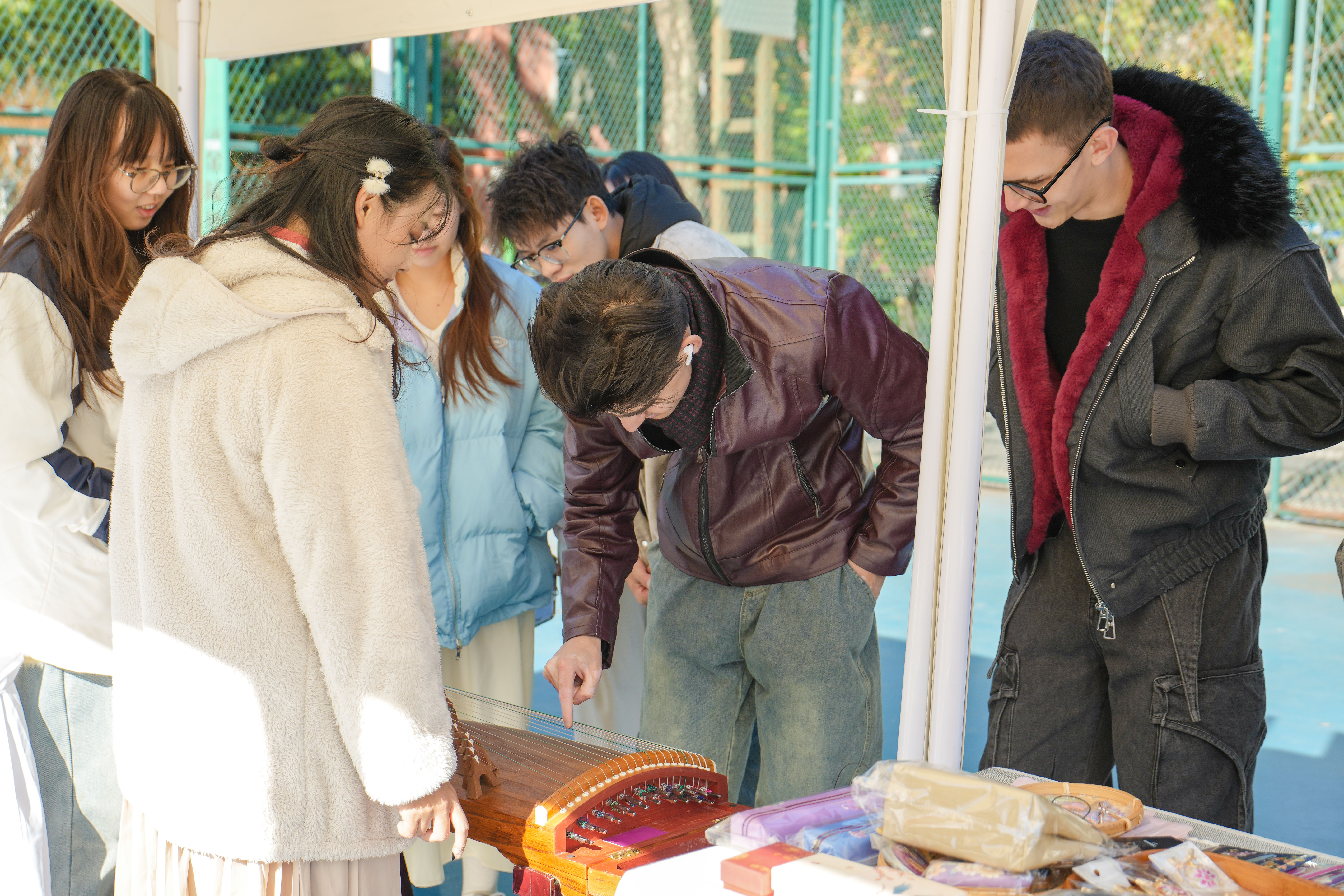 十余组优质非遗摊主带来的特色作品,成为市集的“吸睛亮点”。原创木作、手工蜡染、古法琉璃饰品、现代苏绣作品,兼具传统韵味与当代设计感;原创陶瓷、花丝镶嵌国风珠宝、果壳枝叶手作好物凭借深厚文化底蕴收获不少关注。悠扬的琴声与典雅的汉服造型吸引师生驻足观赏、拍照留念,古筝演奏与汉服展示环节为市集增添了别样韵味,让大家在视听享受中邂逅传统文化之美。