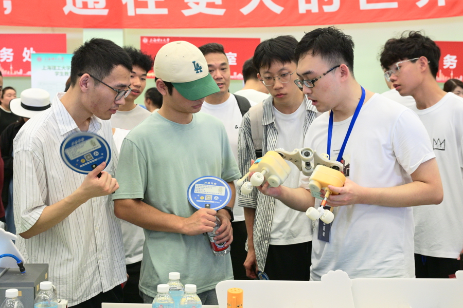 在机械工程学院的迎新展台前,大四学长彭新宇热情地向学弟学妹们“安利”他斩获第十四届上海市大学生机械工程创新大赛一等奖的“智能多功能可折叠按摩仪”。“它不仅能手机互联一键调控,还能自由折叠拆卸,目前市面上还没有同类产品……”彭新宇的介绍,引得新生们连连称奇。展台上,仿生蝴蝶、软体管道爬行机器人、果树剥壳机等一系列获奖作品也同样吸睛,让新生近距离感受到智能制造的魅力。