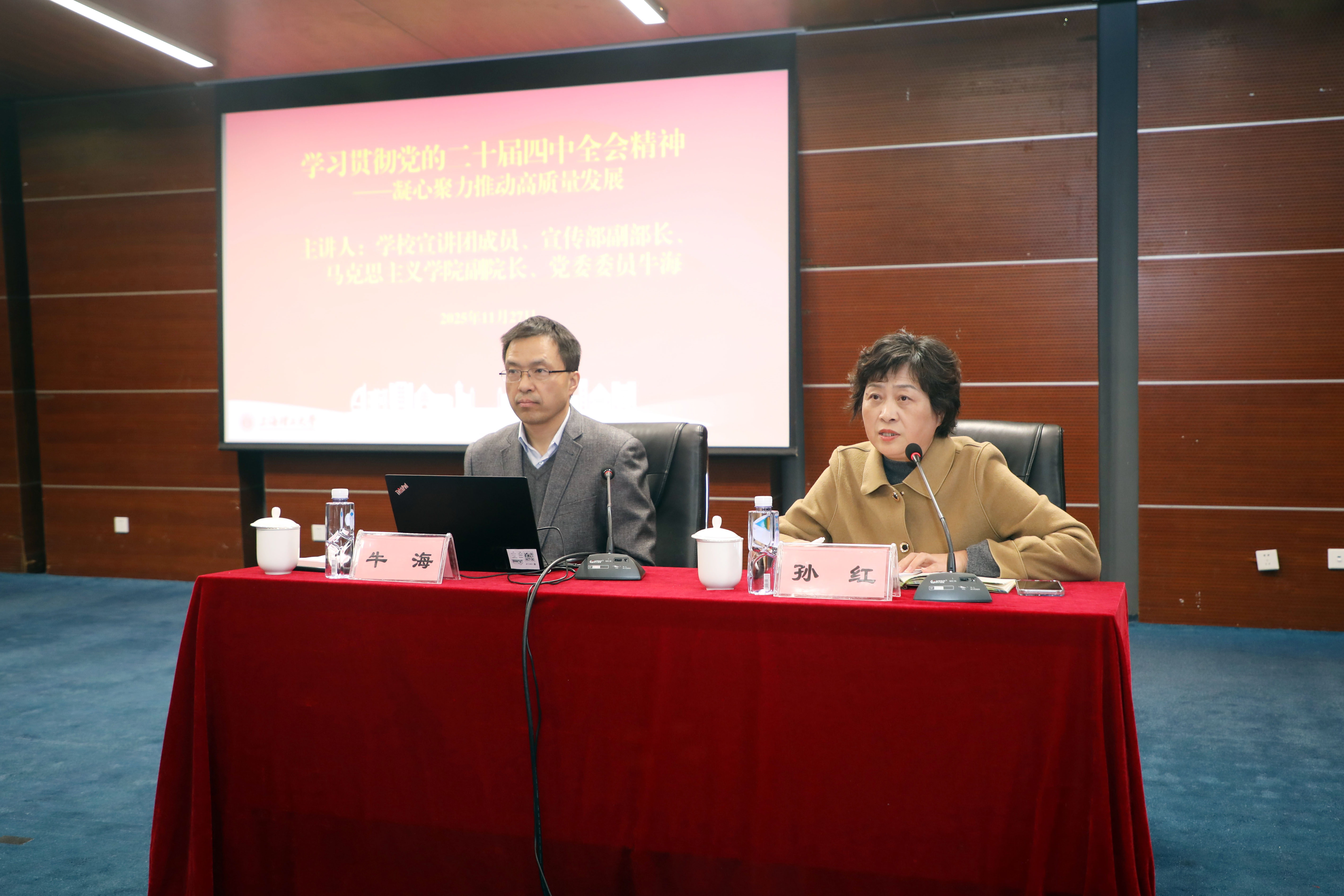 11月27日下午,机关党委邀请学校宣讲团成员、党委宣传部副部长、马克思主义学院副院长牛海为机关党员干部做党的二十届四中全会精神专题报告。本次专题学习旨在学习贯彻党的二十届四中全会精神,帮助机关党员干部学习领会全会精神的丰富内涵,加强服务型机关建设,为推动落实学校教育综合改革各项任务、推进学校事业高质量发展凝聚共识、凝聚智慧、凝聚力量。机关200余名党员干部参加。会议由机关党委书记孙红主持。