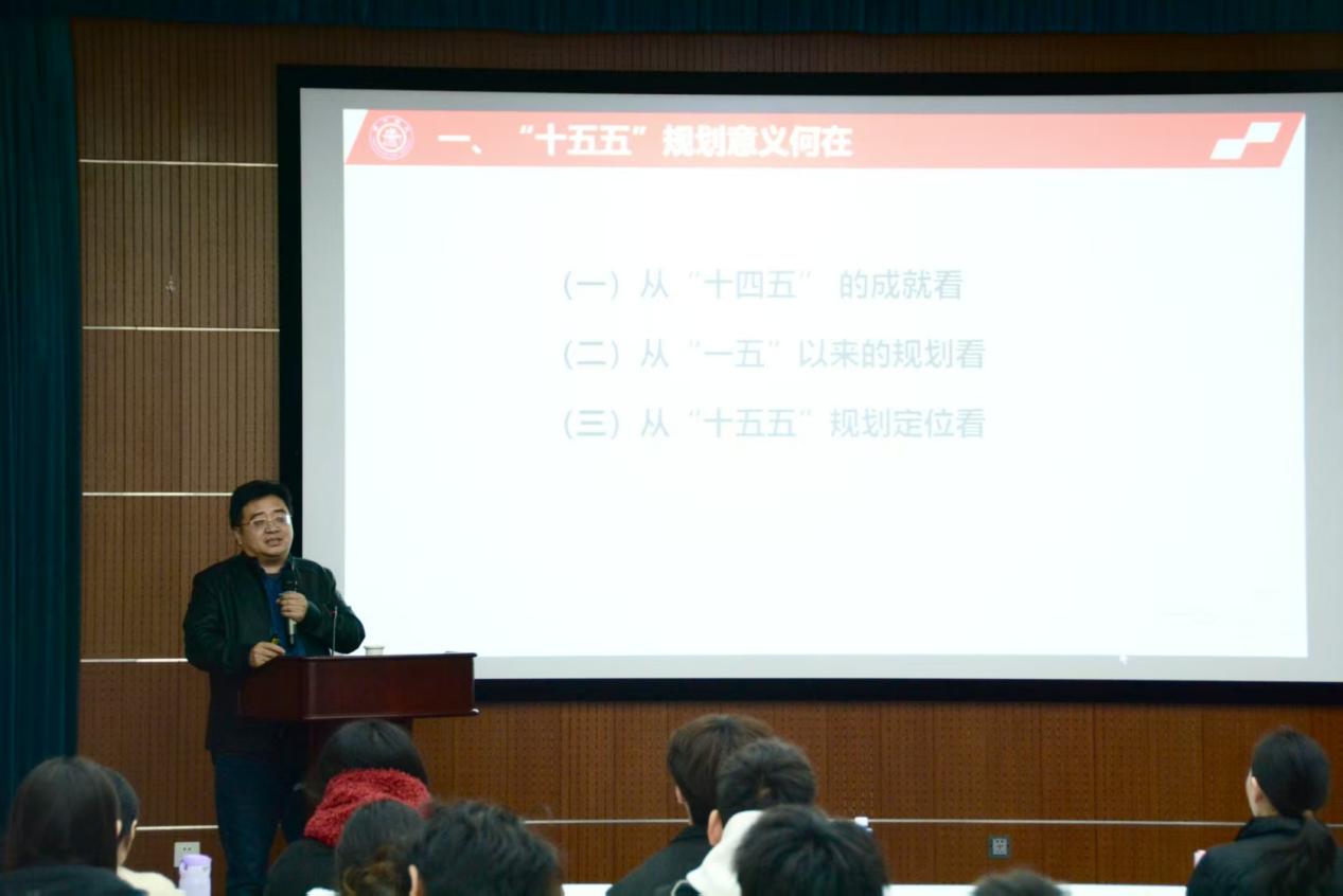史宏波作题为《解码“十五五”——现代化跃迁路线图》的专题报告。报告围绕“社会主义现代化强国蓝图”展开,从四大维度系统解读“十五五”规划的核心要义:维度一聚焦 “十五五规划意义何在”,通过梳理 “十四五” 时期我国在科技、教育、医疗、生态环境、国家安全等领域的显著成就,回溯自 “一五” 以来五年规划紧扣时代需求的实践脉络,明确 “十五五” 作为 “为基本实现社会主义现代化夯实基础、全面发力关键时期” 的战略定位;维度二直击 “十五五时期特殊在哪”,从国际环境的复杂演变、国内发展的阶段特质、我国拥有的独特优势三个层面,深入剖析新时期面临的机遇与挑战;维度三解答 “十五五究竟要干什么”,详细阐释规划的指导思想、遵循原则、主要目标与重点任务,清晰勾勒出国家发展的行动蓝图;维度四阐释 “十五五” 规划的四大鲜明特质,明确其以 “引领新质生产力” 为创新之特、以 “筑牢根基” 为产业之特、以 “构建统一大市场” 为市场之特、以 “制度型开放” 为开放之特,为在场师生清晰呈现了一幅现代化跃迁的路线图。