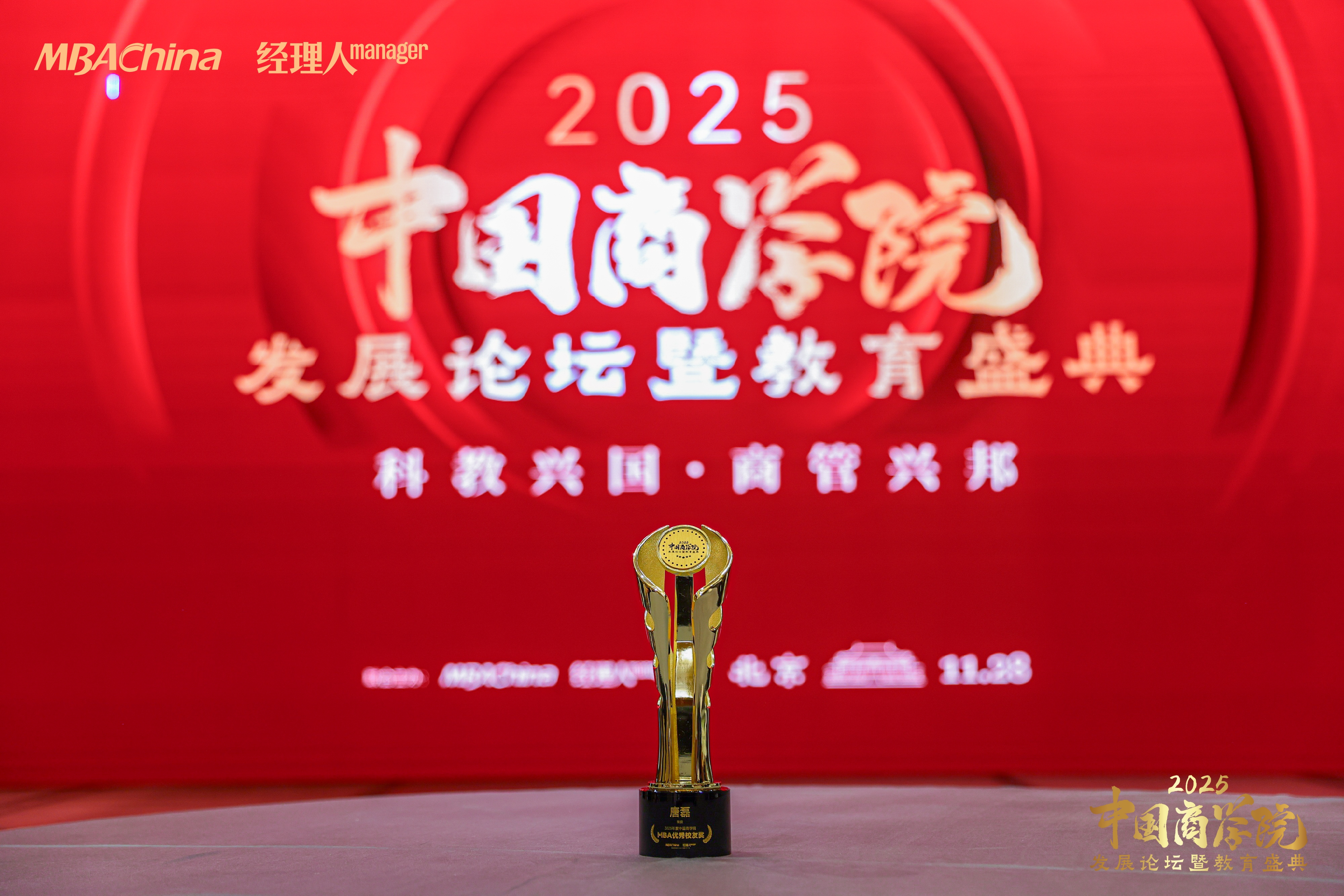 11月28日,由 MBAChina 与《经理人》杂志联合主办的“2025年度中国商学院发展论坛暨教育盛典”在北京举办。作为中国商科教育领域的高规格年度盛会,本次活动汇聚全国百余所院校的三百余位院校领导、专家学者及相关负责人,共同探讨中国商科教育的革新方向。