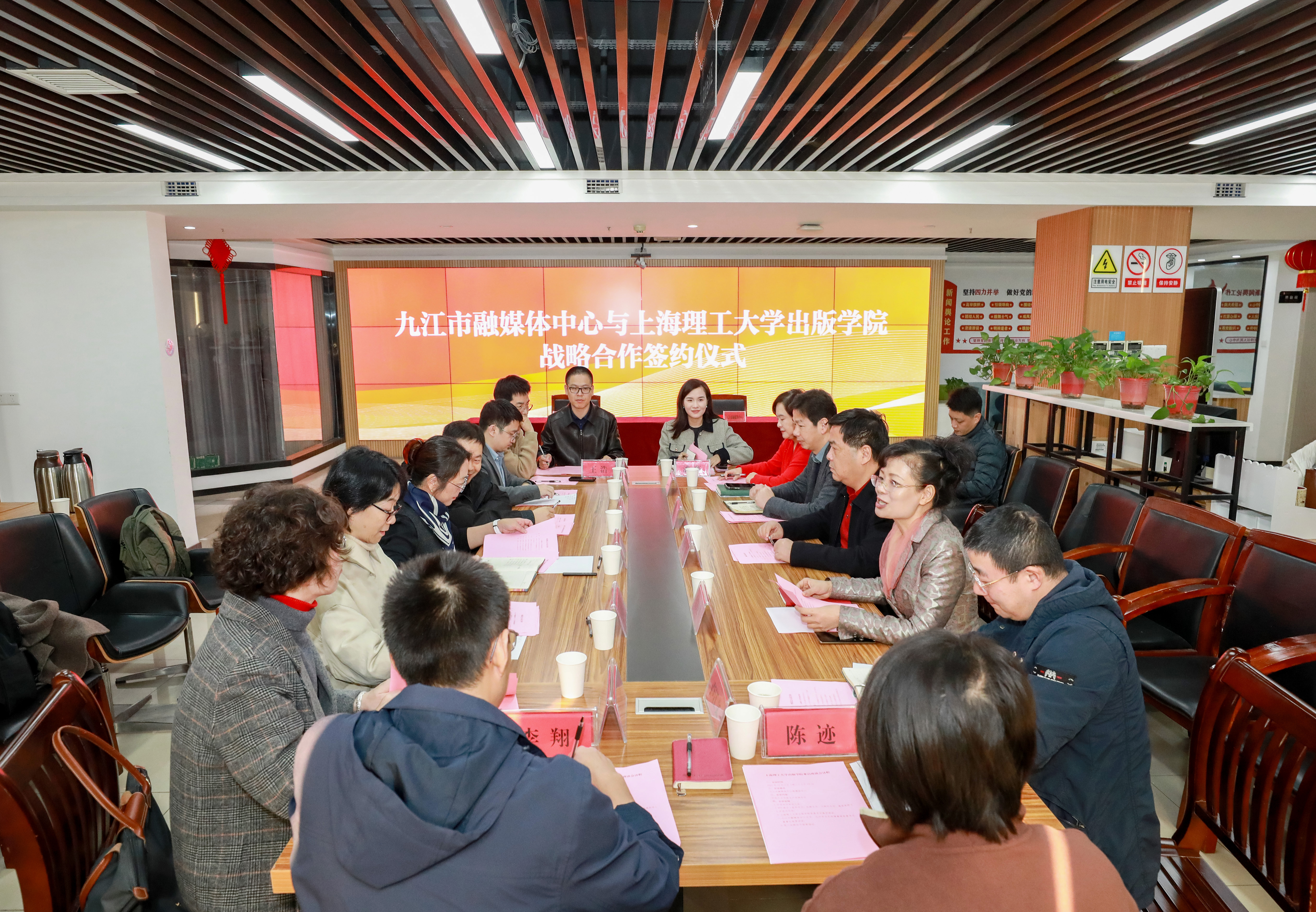 12月2日,经上海理工大学九江创新研究院引荐和推动,出版学院党委书记张华一行应邀至九江市融媒体中心(集团)走访交流,并与九江市融媒体中心签订《战略合作框架协议》。双方将共同构建集科技创新、媒体传播与产业应用于一体的新型合作平台,充分发挥学院科研与人才优势,助力地方主流媒体转型升级,共同探索“媒体+科技”融合发展的新范式。九江市融媒体中心主任,市文化传媒集团党委书记、董事长张雷,九江市融媒体中心副主任(副总编辑)江晓坚等参与此次活动。