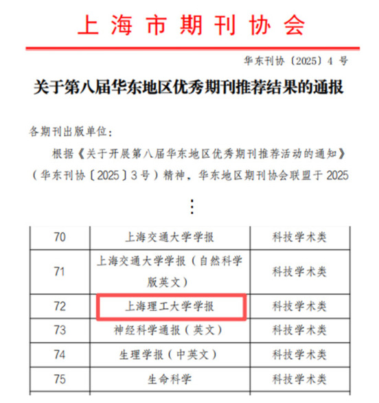 近日,华东地区期刊协会联盟组织开展了第八届华东地区优秀期刊推荐活动。12月5日,经各省(市)期刊协会初评推荐,华东地区优秀期刊评审委员会终评审议通过,上海市共有130种期刊入围第八届华东地区优秀期刊,《上海理工大学学报》成功入选。