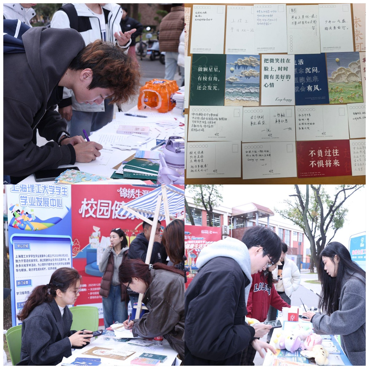 活动现场模拟社区服务形态,设立了多个开放式互动“摊位”,构建了一个集探索、生活与情绪支持于一体的临时“成长社区”。校学业发展中心的摊位贴心提供了各类实用学习资料与生涯规划工具,同学们可自由取阅,获取即时的学习与生涯发展支持。海鸥计划—尚理湾设立的“未来加油栈”则格外温馨,鼓励同学们亲手书写祝福明信片,或为奋斗中的自己寄语打气,或为同伴送上暖心鼓励,情绪价值满满。锦绣生涯工作室还将企业赞助的洗发水、液体香皂等发放给参与的师生,提供生活便利。大家在轻松自然的社区氛围中,不仅探索了职业可能性,更亲身感受到了来自学校、社会以及同伴的立体支持网络。