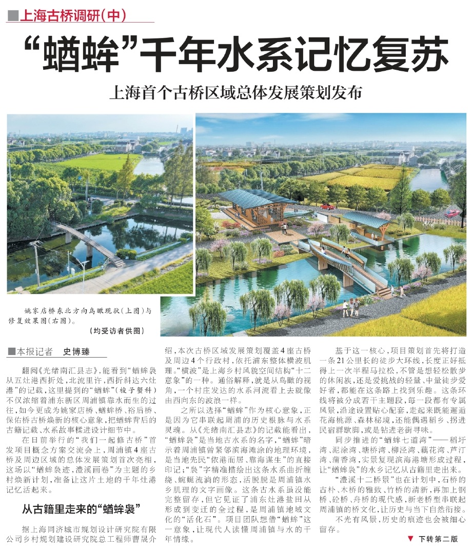 8月25日,基于七所高校针对全市古桥的调研成果,由上海市规划和自然资源局乡村规划处主办的“我们一起修古桥”首发项目概念方案发布会在浦东新区瓦南村举行,首发项目选取的周浦镇4座古桥及周边区域的总体发展策划及规划设计方案首次亮相,我校与同济大学、上海大学完成的古桥保护利用概念规划设计方案作为入选方案进行汇报交流。规划设计方案过程中,出版学院师生团队在对现场进行多次深度踏勘的基础上,基于对周浦镇姚家店桥的历史文化解读,为其量身定制了保护与利用方案,让古桥既留得住历史,又能融入现代生活。