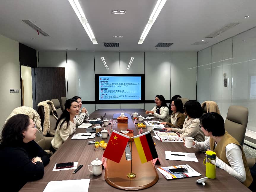 在座谈交流会上,双方重点围绕双元制教育培养模式、德语在双元制教学中的应用场景、职业资格认证标准及毕业生就业发展路径等关键议题展开深入探讨。沈莲莲表示,外语学院高度重视应用型人才培养,积极探索“语言+专业技能”融合育人模式。此地实地走访旨在精准对接企业需求,将产业实践要素融入教学全环节,切实提升学生行业适配能力。她强调,德语专业应充分吸收双元制教育“理论与实践并重”的核心优势,进一步强化实践教学环节,着力培养兼具扎实语言功底与专业素养的复合型人才,更好服务长三角地区中德合作企业的人才需求。卞虹、曹芸就德语专业如何精准对接中德合作企业需求、优化课程体系等具体问题与企业深入交换意见。经过充分沟通,双方就开展短期研学活动、共建特色课程等合作事项达成初步意向。