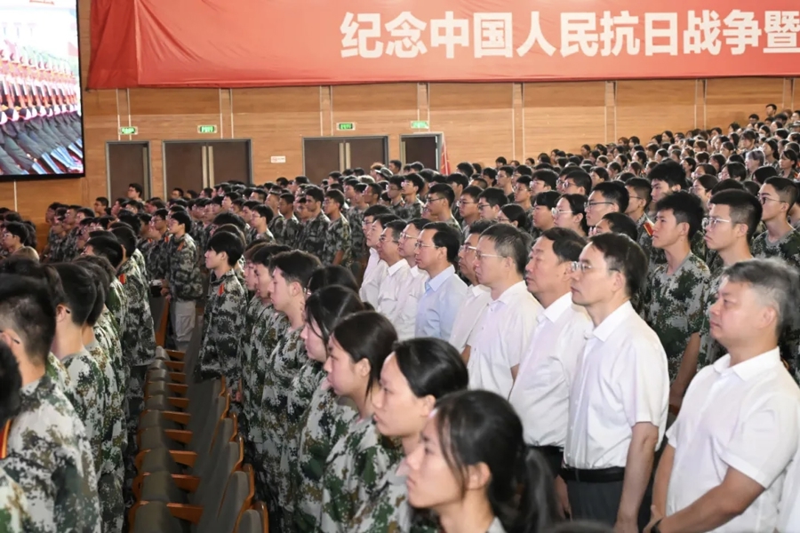 同济大学师生以各种方式收看纪念活动实况直播。学校组织正在参加军训的全体2025级本科新生在四平路校区大礼堂、教学北楼集中收看,校党委书记郑庆华等校领导在大礼堂与同学们一道观看直播盛况。