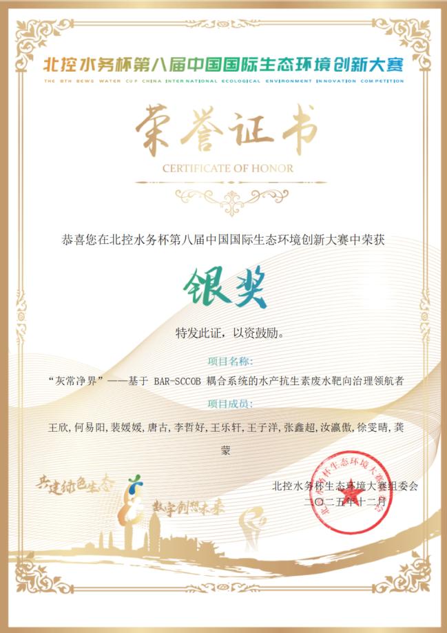 11月28日,第八届中国国际生态环境创新大赛总决赛在云南昆明圆满落幕,环建学院学生创新团队项目“灰常净界——基于BAR-SCCOB耦合系统的水产抗生素废水靶向治理领航者”获全国银奖。