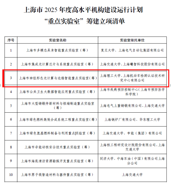 近日,上海市科学技术委员会正式发布2025年度高水平机构建设运行计划“重点实验室”筹建名单。由上海理工大学作为依托单位,联合上海机动车检测认证技术研究中心有限公司(以下简称“上海汽检”)共同申报的“上海市神经形态光计算与边缘智能重点实验室”成功获批立项,正式进入筹建阶段。该实验室由中国工程院外籍院士、上海理工大学光子芯片研究院院长顾敏教授领衔建设。