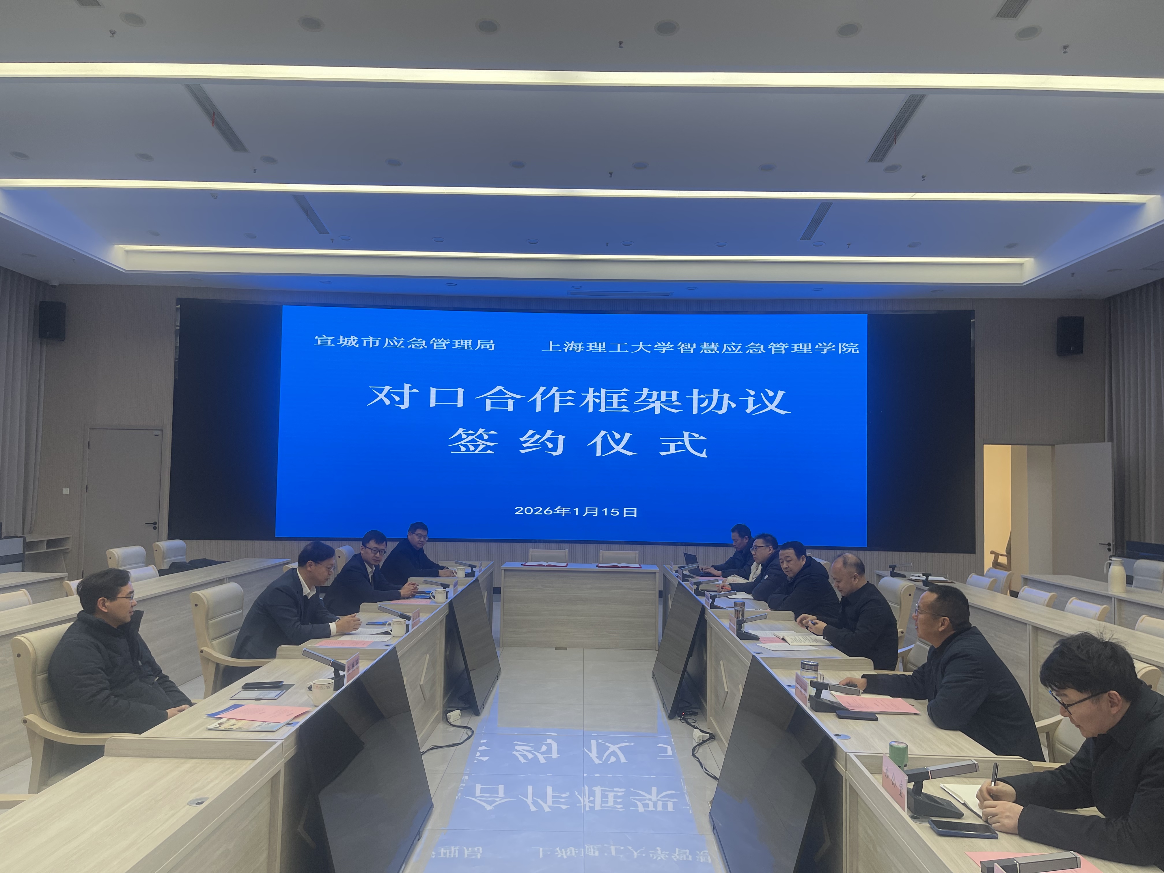 1月15日,上海理工大学智慧应急管理学院一行赴安徽省宣城市,与宣城市应急管理局签订对口合作框架协议。上海理工大学管理学院院长、智慧应急管理学院院长赵来军,管理学院副院长、智慧应急管理学院副院长房志明,管理学院副院长刘魏巍,宣城市应急管理局党委书记、局长周宁,副局长江政义等出席签约仪式。会议由周宁主持。