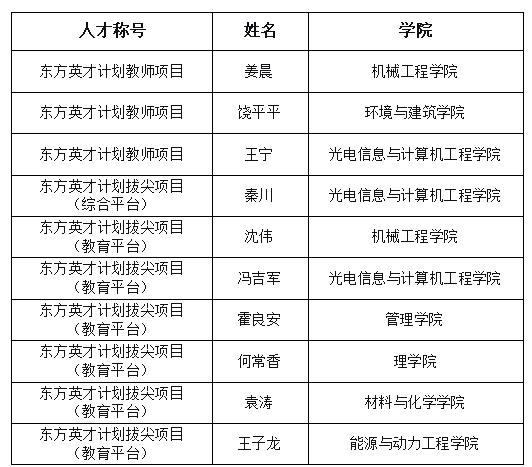 上海市东方英才计划是贯彻落实市委、市政府《关于新时代上海实施人才引领发展战略的若干意见》的重要举措,旨在加速推进上海市高层次人才队伍建设。其中,教师项目遴选支持具有创新能力和实践经验的教师,鼓励其积极参与教育教学改革和创新,提高教育教学质量;拔尖项目遴选支持在创新研究中承担核心任务的拔尖人才;青年项目遴选支持在专业领域崭露头角,具有突出发展潜力的青年人才。2025年度我校3人获批东方英才计划教师项目,7人获批东方英才拔尖项。